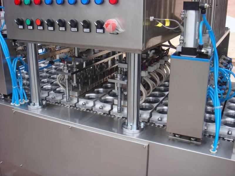 2、 采用氣電、機(jī)械一體設(shè)計,傳動平穩(wěn),從容器的供給、充填、封口、切邊、制品的輸出、廢料收卷等完全自動化,以節(jié)約人力,降低成本。